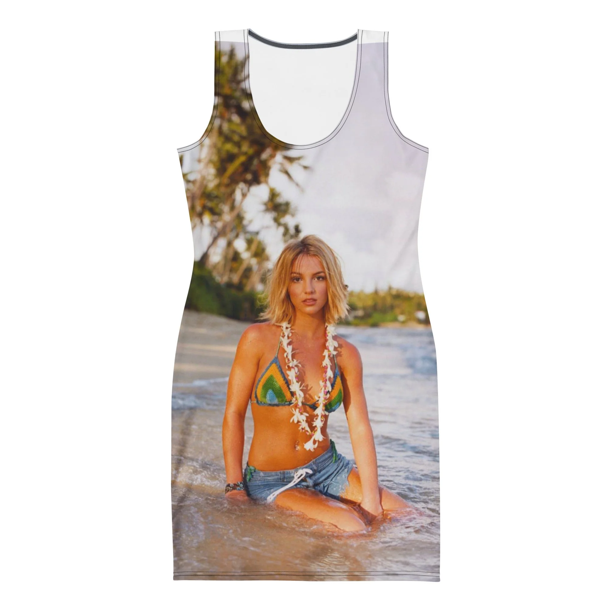 Britney Spearz performed a landmark concert at the Hilton Hawaiian Village in Honolulu on April 24, 2000 during her Crazy 2K tour. This is her enjoying the beach afterwards. Now you too can enjoy the beach and Hawaii by putting the moment on a skin-tight bodycon dress.